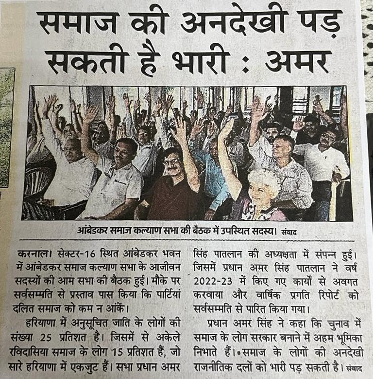 दिनांक 02.07.2023 को अम्बेडकर समाज कल्याण सभा करनाल के आजीवन सदस्यों की आम सभा की बैठक हुई जिस में वर्ष 2022-2023 के आय व्यय के खर्च व वार्षिक रिपोर्ट पेश की व सर्व सम्मति से स्वीकृत की गई
